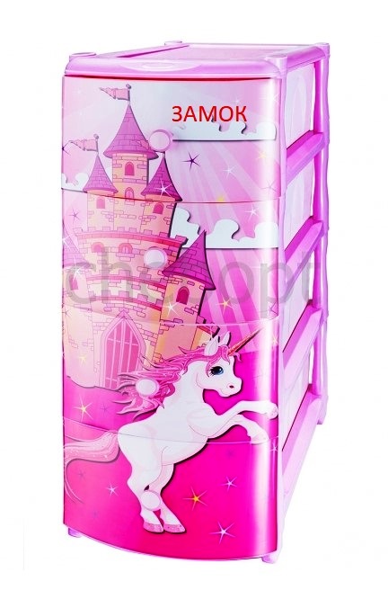 Комод 305 №5 с рис. ЗАМОК (Эльф) для девочек. Данная модель имеет красивый дизайн с изображением замка и единорога, такой дизайн обязательно понравится Вашему ребёнку. Также данные комоды очень хорошо подойдут для помещений с перепадами температуры и присутствием влажности (ванная комната и дача). Изделие сделано из пластика и имеет закруглённые формы, что делает его безопасным для ребёнка и родителей. Высота - 90 см, количество ящиков - 4.