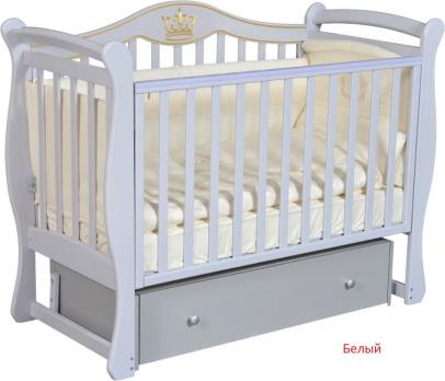 Внизу кроватки предусмотрен закрытый выдвижной ящик на роликовых телескопических направляющих. В нем удобно хранить детские вещи, игрушки и постельное белье. На задней стенке есть декоративная накладка, выполненная в виде короны.