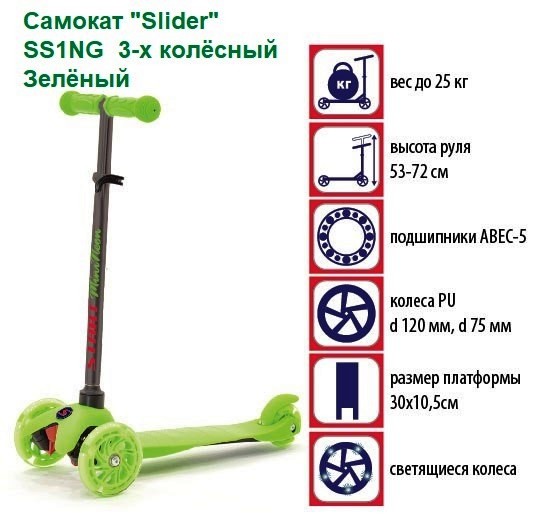 Slider SS1N – трехколесный самокат, предназначенный для детей от 3 до 5 лет. Модель оснащена регулируемым по высоте рулем Т-образной формы, что позволяет подстраивать самокат под рост ребенка. Среди преимуществ Slider SS1N можно отметить легкую раму, широкую подножку с нескользящим покрытием и светящиеся колеса!