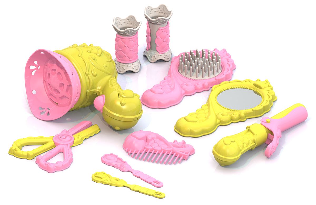 Комплектация: фен, плойка, 2 бигуди, расческа, безопасные зеркало и ножницы, расческа-гребешок и 2 заколки.