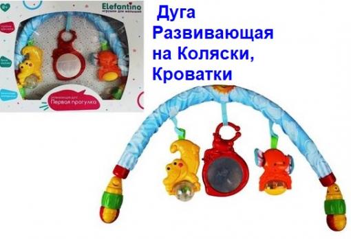 Дуга с подвесными погремушками, представленная производителем Elefantino, привлечет внимание малыша яркими цветами и порадует его симпатичным видом игрушек. Дуга изготовлена из пластика, на нее надет мягкий текстильный чехол. Подвесные игрушки изготовлены из текстиля, они снимаются с дуги. Сама дуга прикрепляется к кроватке или коляске при помощи специальных механизмов, которые просты в применении. Малыша позабавят приятные звуки, которые раздаются во время контакта с игрушками.