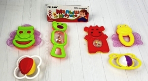 Набор состоит из 4 ярких красочных разнообразных погремушек с удобными захватами для ручек малышей.