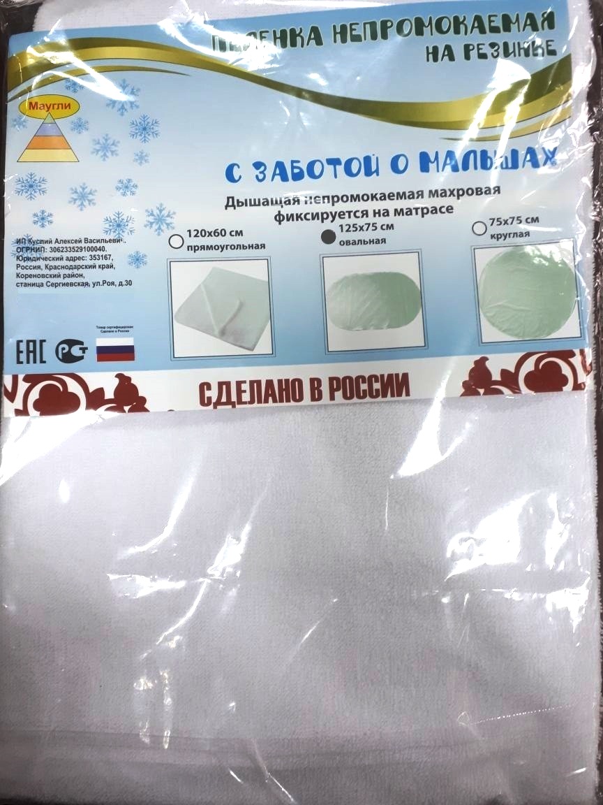 В избранном Убрать В избранное Пеленка 0456Н "Маугли" махра, овальная (125*75) LUX Артикул: 0456Н Есть в наличии: скоро закончится Сообщить когда будет Вес: 0 кг. 0 руб. 800руб. Купить Купить одним кликом Сравнить Описание Отзывы 125 х 75 см на детскую кровать овальныйНепромокаемый на резинке по углам Маугли СтандартБелоснежный. Махровый. Нежный и приятный для снаПр-во Россия