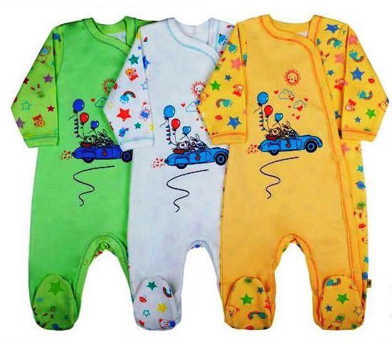 Комбинезон ясельный из набивного и гладкого интерлока с печатью на полочке, длинный рукав, смещенная застежка на кнопках, края изделия обработаны рибаной х/б.