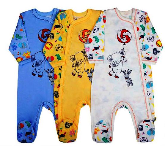 Комбинезон ясельный из гладкого и набивного кулира с печатью на полочке, длинный рукав, смещенная застежка на кнопках, край изделия обработан рибаной х/б.