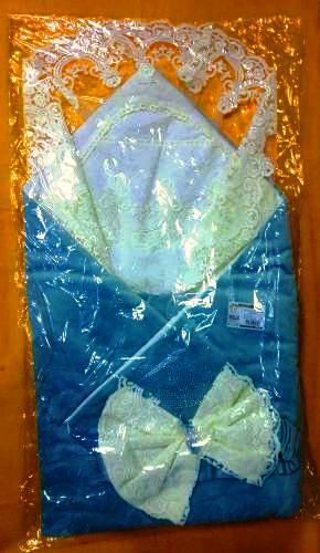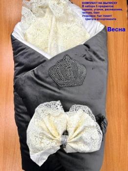 В наборе 5 предметов: одеяло, уголок, распашонка, чепчик, бант