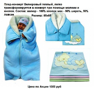 Материал: 100% хлопок Наполнитель: холлофан Красивый и уютный плед-конверт для малыша, верх выполнен из мягкого велюра, подкладка из овечьего меха. Застёгивается на молнию. В разложенном виде превращается в тёплый лёгкий плед. Размер: 90x90см Производитель: Золотой Гусь, Россия
